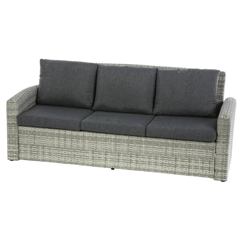 Ce canapé est conçu spécialement pour l’extérieur : sa structure est en aluminium traité époxy antirouille, son habillage est en résine synthétique tressée et ses coussins sont en polyester 180 g/m² traités déperlant et déhoussables.