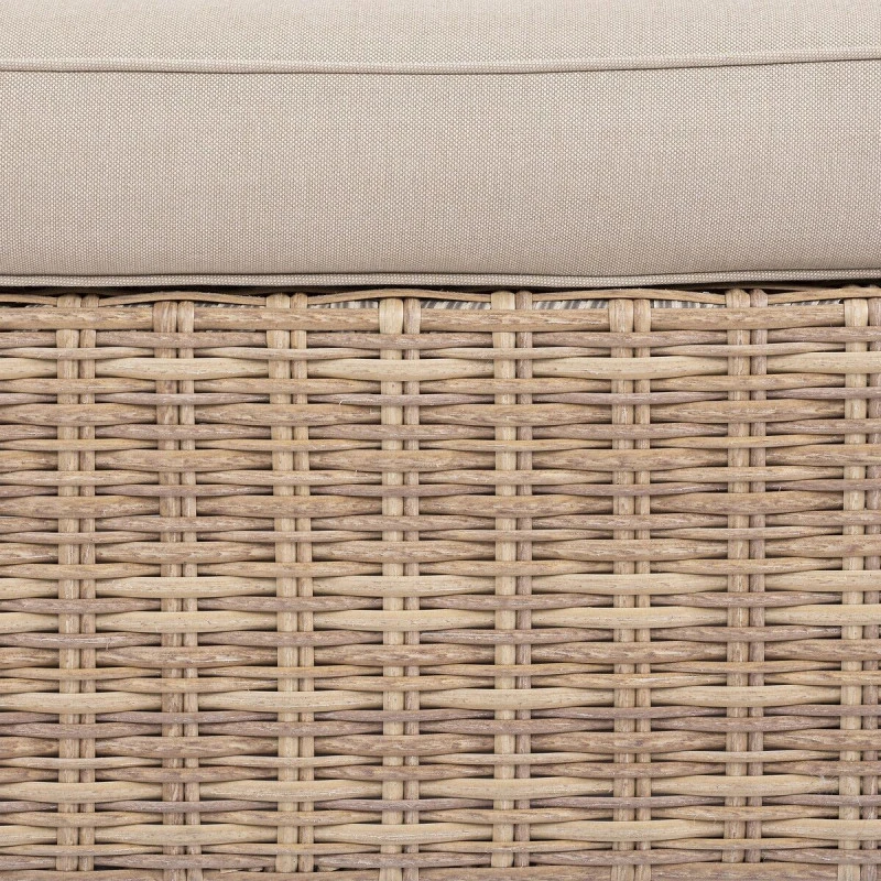 Résistant, le fauteuil dispose d’une structure en aluminium traité époxy et un habillage en résine tressée.