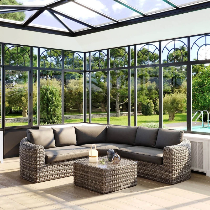 Le salon Mooréa dispose d’une structure en aluminium traité époxy antirouille habillée de résine synthétique tressée.
