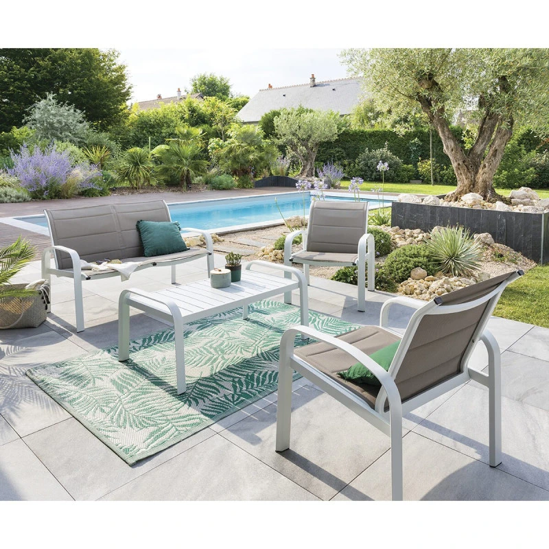 Profitez de votre extérieur au soleil avec ce salon de jardin noisette et structure blanche Elyn de la marque Hespéride.