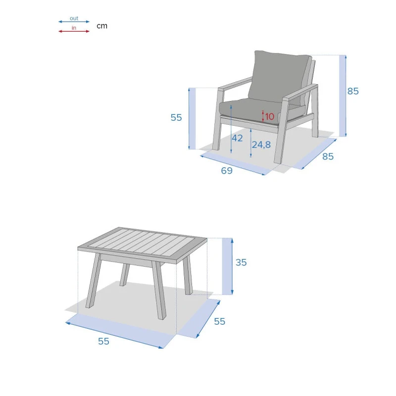 Les coussins d’assise sont déhoussables et recouverts de tissu déperlant facilitant l’élimination des petites pluies.